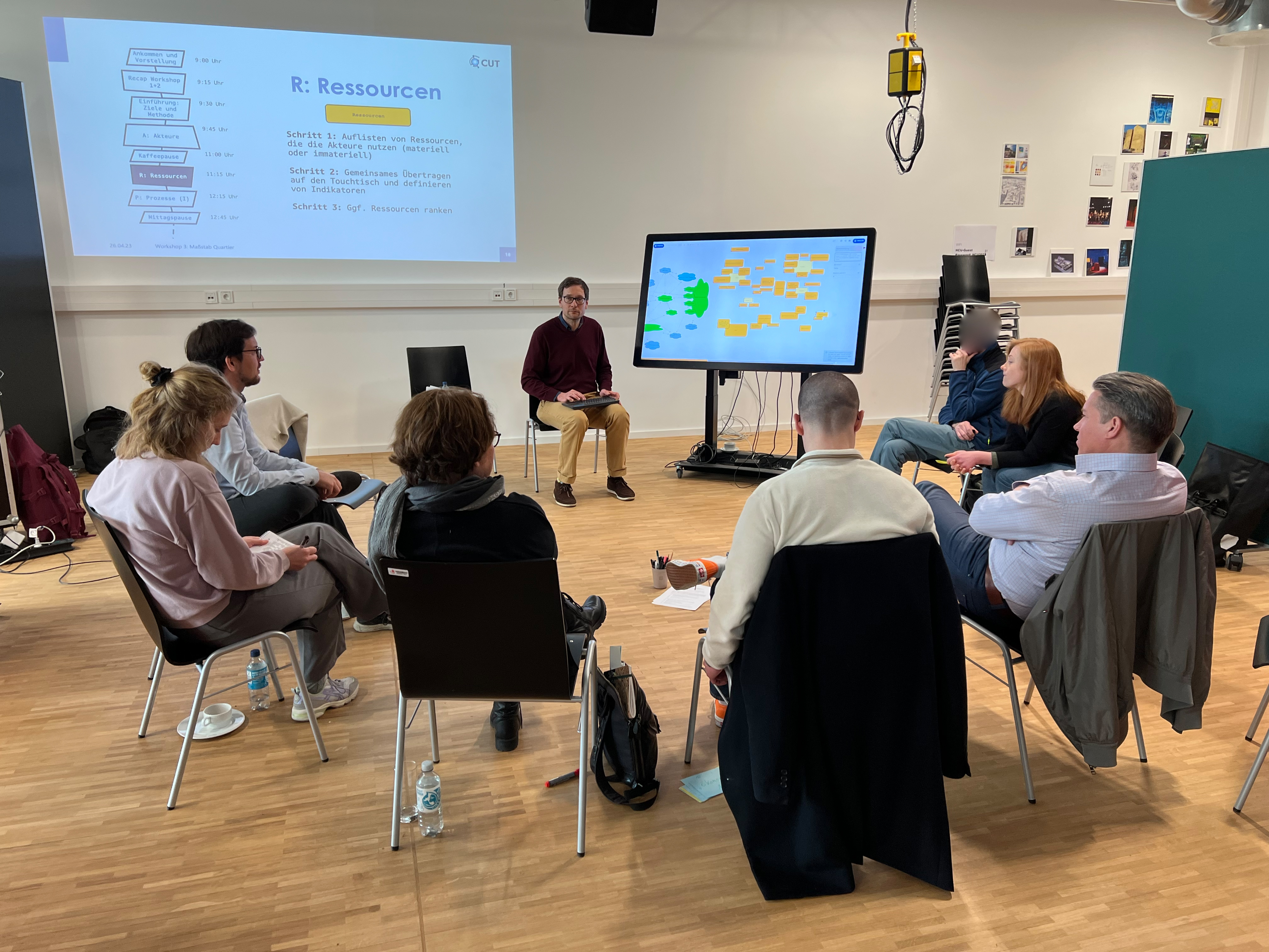 In einem Meinungsbild sprach sich die große Mehrheit der Teilnehmenden dafür aus, am Thema „Energetische Gebäudesanierung ohne Gentrifizierungseffekte“ arbeiten zu wollen und hierfür ein Simulationsmodell im Rahmen der experimentellen Forschung des „Connected Urban Twins“ Projektes co-kreativ zu entwickeln. Dies wurde im Rahmen zwei halbtägiger Workshops und eines ganztägigen Workshops bis Ende Mai 2023 durchgeführt.
